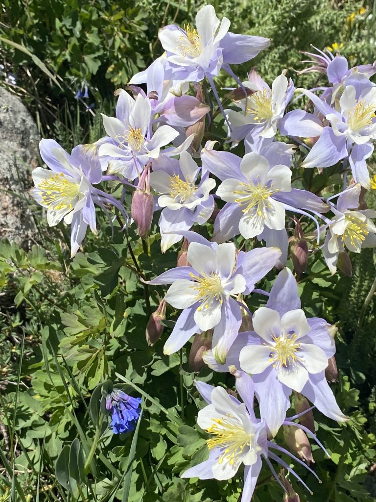 A. caerulea, Rocky Mountain columbine has large bi-colored, upward-facing flowers – white petals and blue to violet sepals and spurs. Reaching between 6-31″ tall – the shorter heights being all it usually manages in its native mountains, but it will also grow happily in New England where it can reach taller heights.