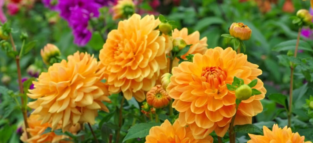 • Decorative dahlias, which have large, double flowers in a wide range of colors and reach about 3-4’ tall.