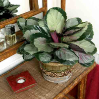 Care tip: If leaves are dry at the tips, calathea needs more humidity. Set on a tray of pebbles in water to increase the humidity around the plant.