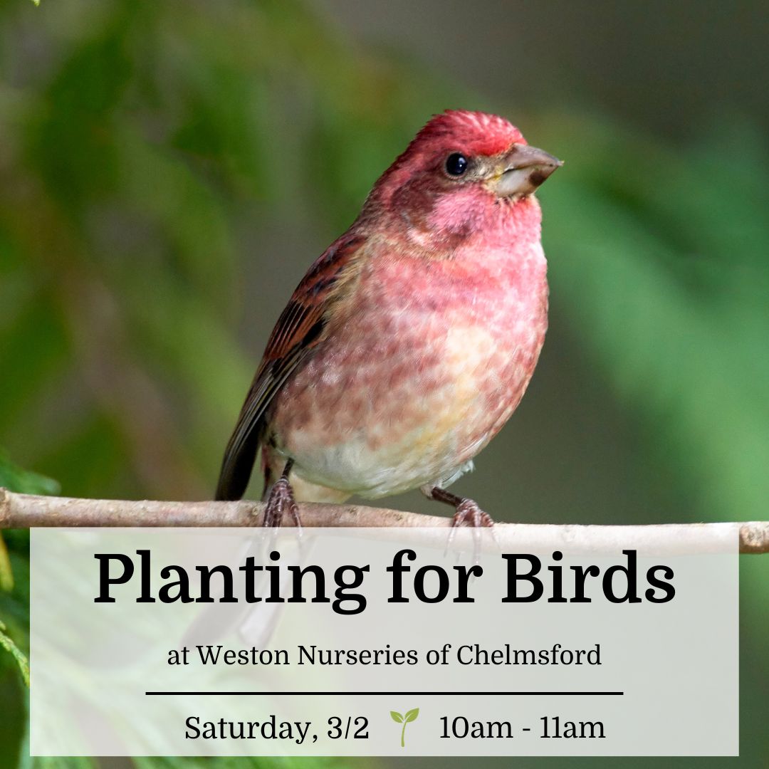 For those of you who wish to encourage more birds into your yard come and learn which plants are beneficial to birds. Whether by providing seeds and berries, or providing