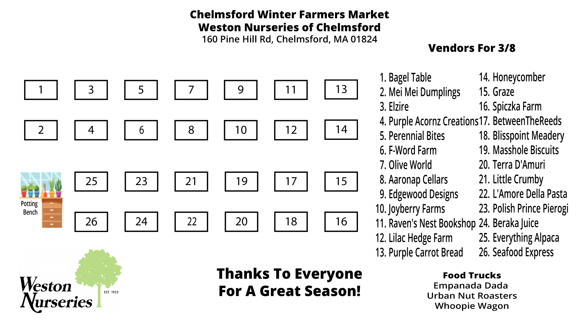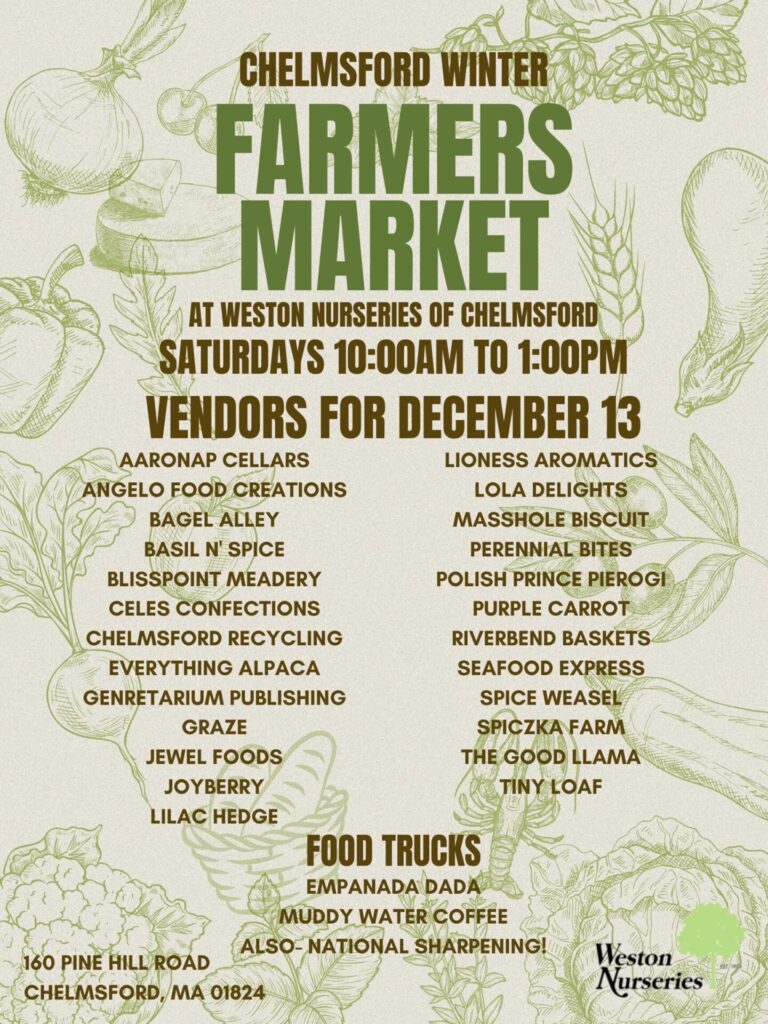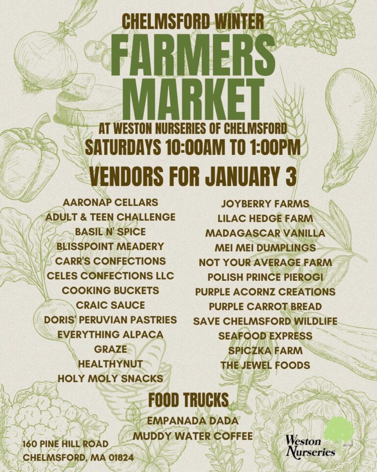 The Chelmsford Winter Farmer’s Market will be at Weston Nurseries of Chelmsford again for the 2025-26 season every Saturday beginning November 1.