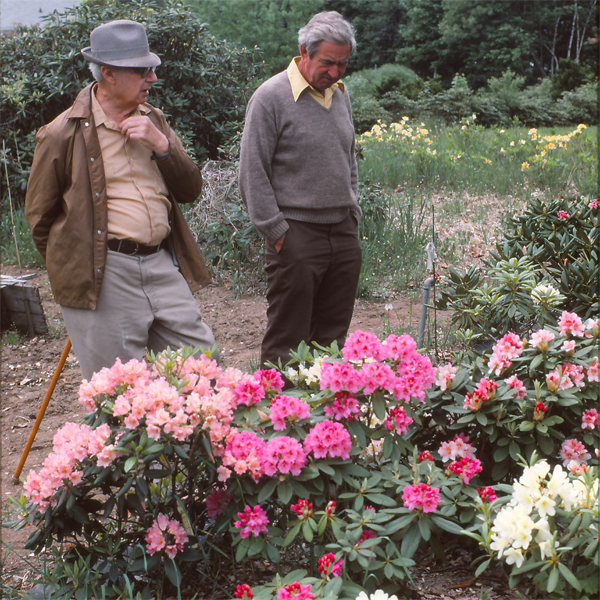 Recognizing improvement potential in the small-leaf types, Ed used Carolina rhododendron as a parent in his first hybridizing attempt: Rhododendron ‘PJM’ was the fortuitous result. Arguably today’s most widely used rhododendron cultivar in this region, ‘PJM’ is readily-recognizable for its vibrant-purple ushering-in-the-spring flowers, distinctively-colored and aromatic winter foliage, hardiness and availability. Over the next four decades Ed made thousands of hybrid crosses, largely focused on improving the features of small-leaf rhododendrons.