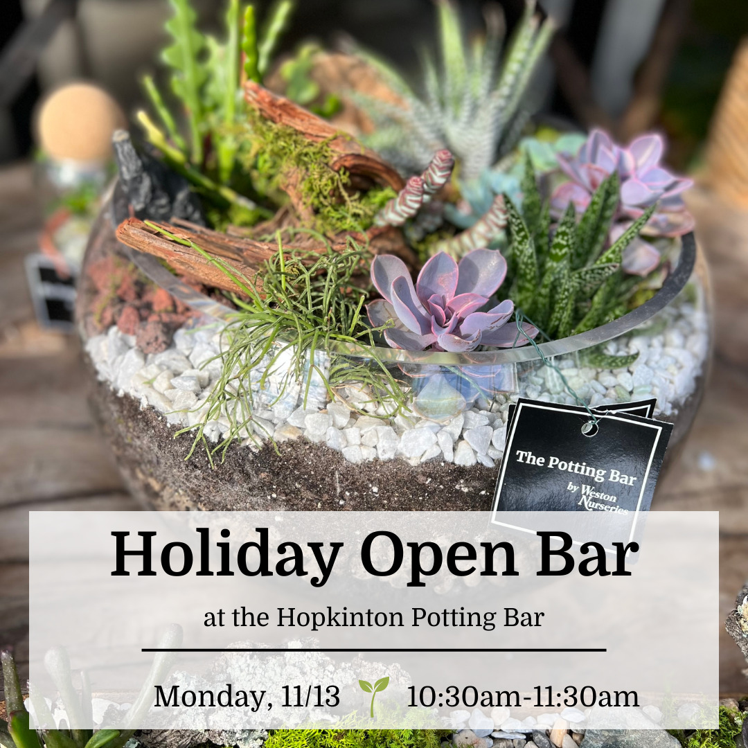 Its holiday time at the Potting Bar! The Weston Nurseries Greenhouse team welcomes you to come to our Holiday Open Bar. Make the perfect Thanksgiving table centerpiece, hostess gift, terrarium, or festive Fall décor for your home. Browse our seasonal offerings, decorative items and planters to incorporate into your design.