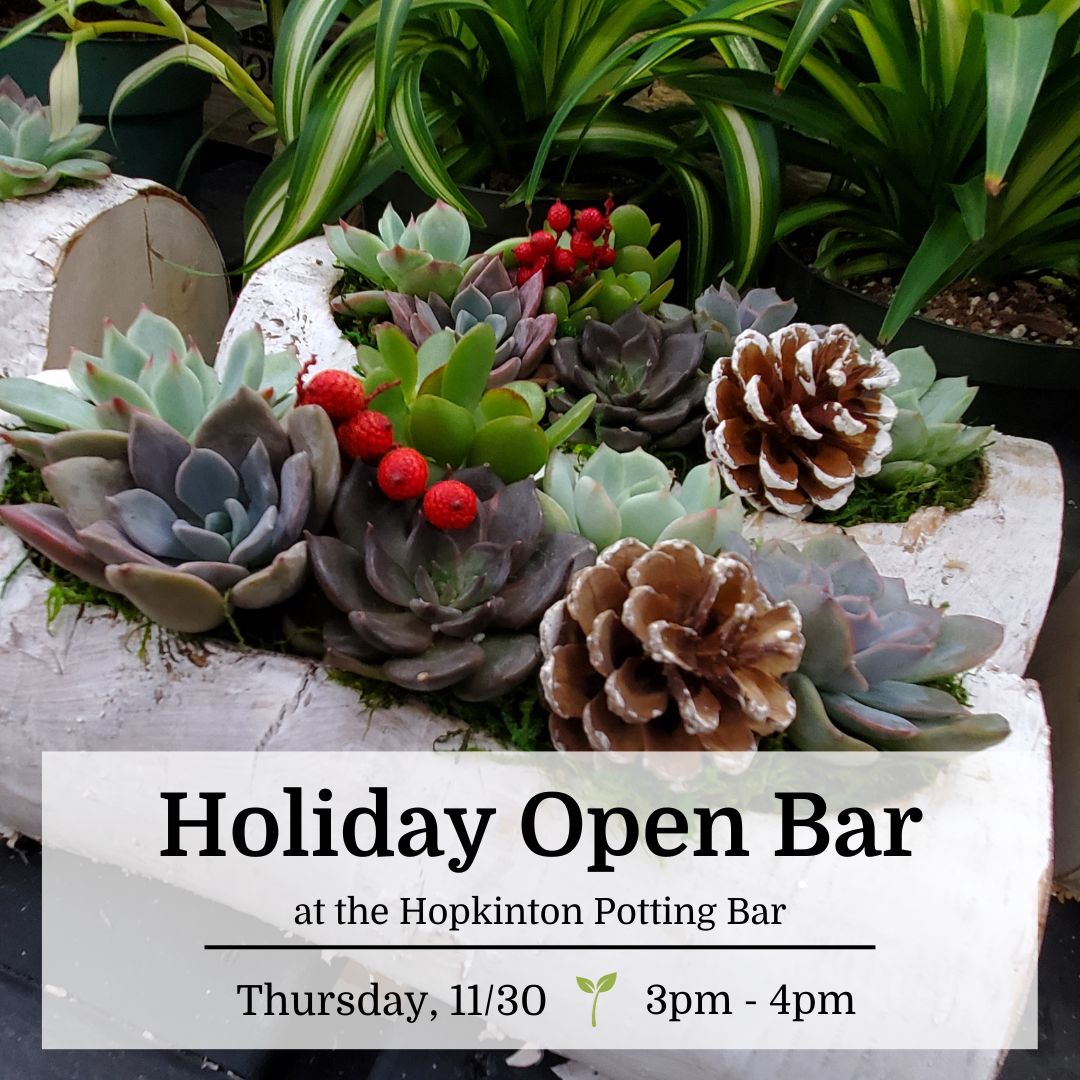It’s holiday time at the Potting Bar! The Weston Nurseries Greenhouse team welcomes you to come to our Holiday Open Bar. Make the perfect Christmas table centerpiece, hostess gift, terrarium, or festive Winter décor for your home. Browse our seasonal offerings, decorative items and planters to incorporate into your design.