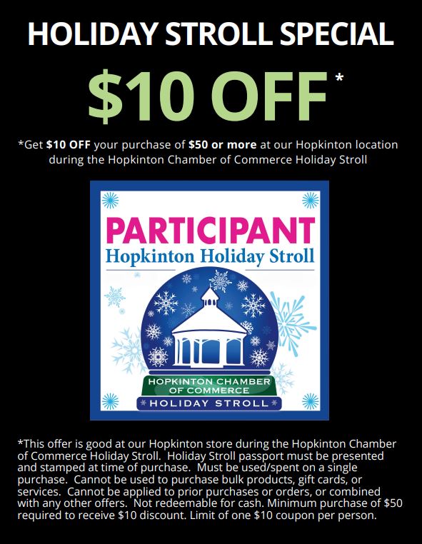 Come celebrate the season and our local businesses with our Annual Hopkinton Holiday Stroll!  Get your passport stamped at Weston Nurseries to qualify for our special sale: