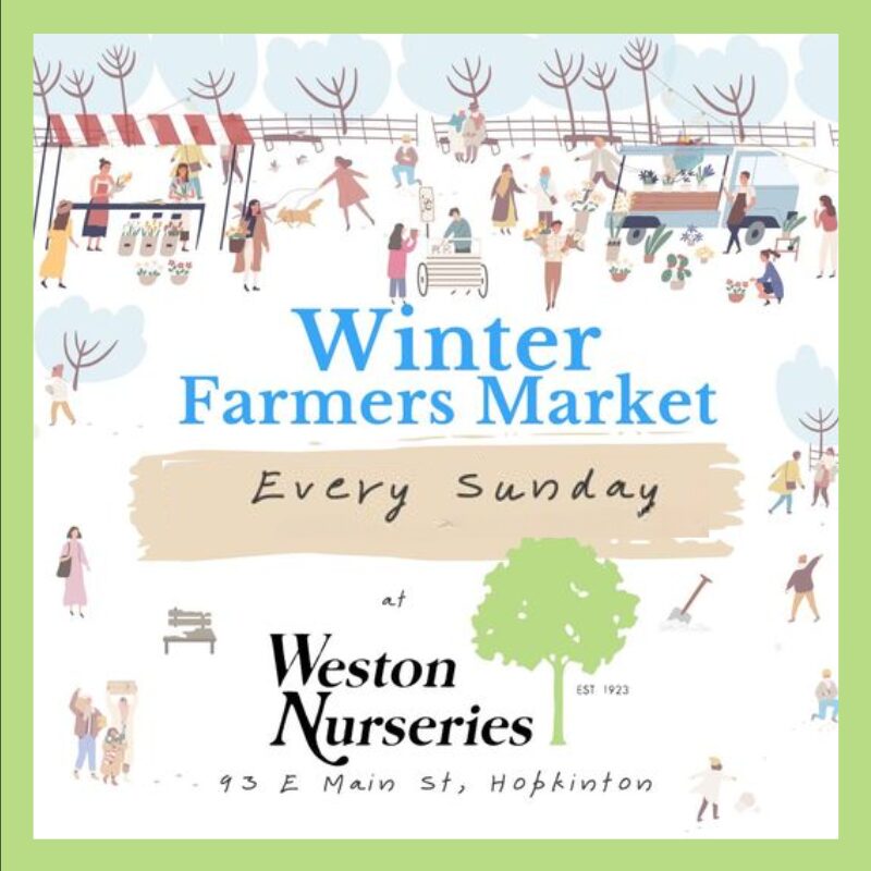 Weston Nurseries Garden Center - Hopkinton 93 East Main St, HopkintonDates: Sundays November 3rd - March 16th Time: 10am - 2pm Location: Weston Nurseries of Hopkinton Price: free! About this event: The Hopkinton Farmer's Market will be hosted by Weston […]