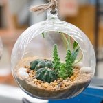 Hanging terrariums are a fun and whimsical way to display some of your favorite plants. Ideal plants for terrariums include succulents, cacti, and humidity-loving plants such as ferns, ivy, and peperomia. If you are creating a terrarium with cacti and succulents, they will require very infrequent watering. For humidity-loving plants, regular watering and occasional misting will help to keep humidity high within the terrarium environment.