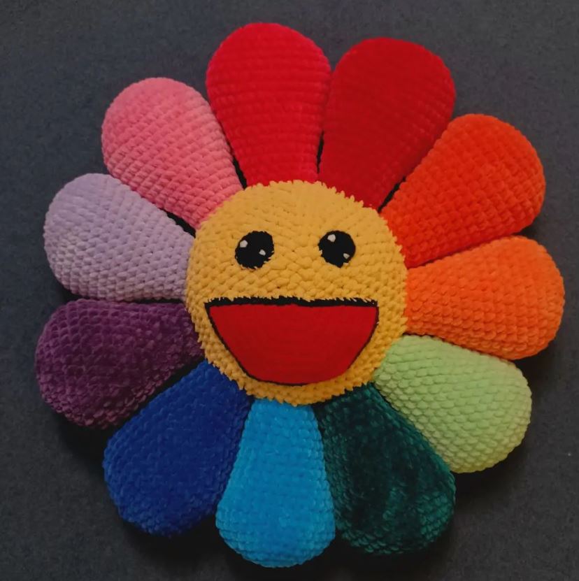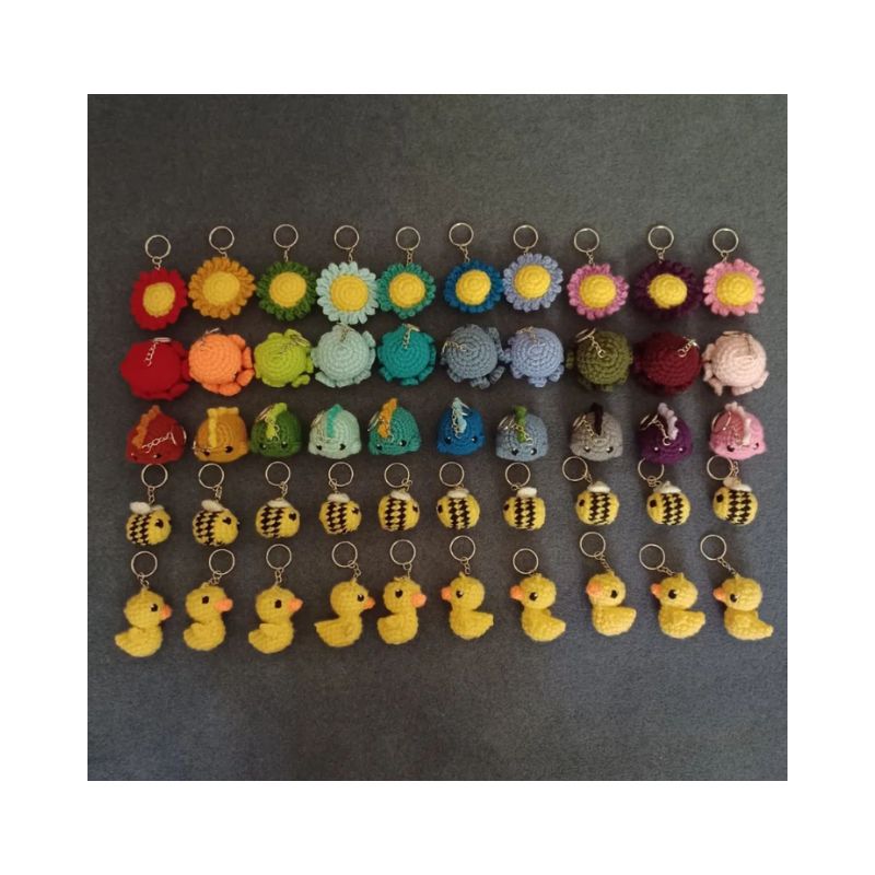 Handmade colorful crochet stuffed animals and accessories including bandanas and keychains.
