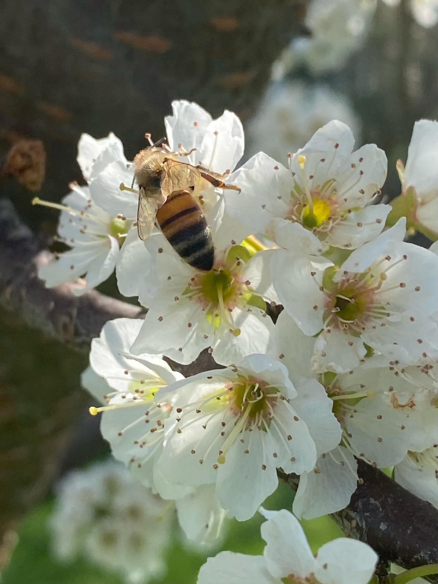 Honey bees, in particular Apis mellifera, the European honey bee, are not native and were first introduced into Massachusetts in 1622, but they are now ubiquitous, being commercially used to pollinate many crops. They are not the only bees that are used as commercial pollinators. Mason bees, and in particular the blue orchard bee (Osmia lignaria), are used for fruit orchards as their hairy bodies are highly effective at trapping and then distributing pollen from flower to flower.