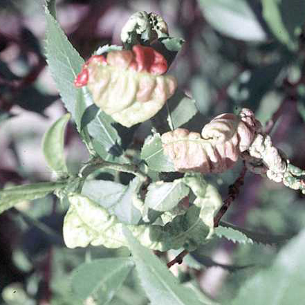 During cool, wet springs developing leaves become thicker than normal and curled with a yellow to red-purple color.