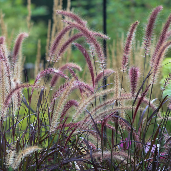 Pennisetum also known as Fountain Grass – Upright with gracefully cascading fountains of leaves and small tan, pink or purple bottle brush flowers. 1- 3 ft