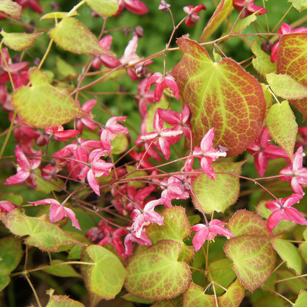 Epimedium, once called Barrenwort or Bishop’s Hat, grows 6-12 inches tall and develops pretty heart-shaped leaves topped with clusters of starlike yellow, white, lavender, or rose flowers in April and May.